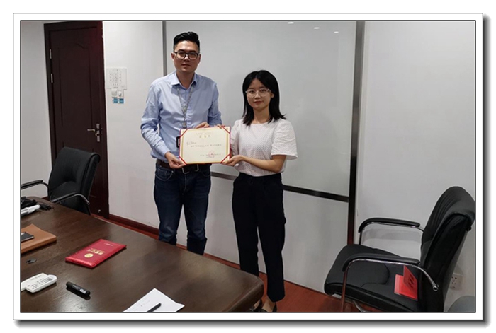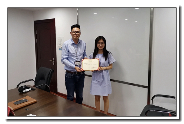 人力資源部孫陽瑯向鄭夢莎頒發優秀學員證書