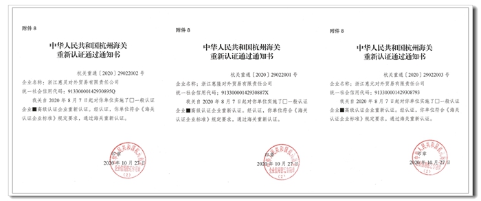 日前,公司下屬浙江惠元對(duì)外貿(mào)易有限責(zé)任公司、浙江惠靈對(duì)外貿(mào)易有限責(zé)任公司、浙江惠隆對(duì)外貿(mào)易有限責(zé)任公司收到了杭州海關(guān)簽發(fā)的《重新認(rèn)證通過通知書》,成為今年杭州關(guān)區(qū)首批通過AEO高級(jí)認(rèn)證重新認(rèn)證的企業(yè)。