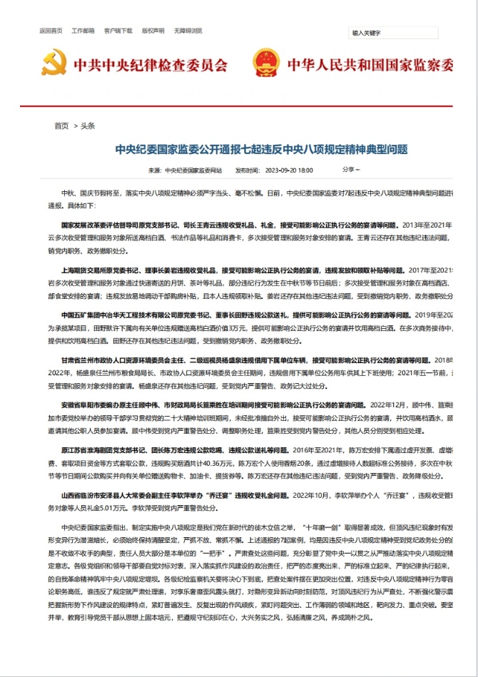 《中央紀(jì)委國家監(jiān)委公開通報七起違反中央八項規(guī)定精神典型問題》